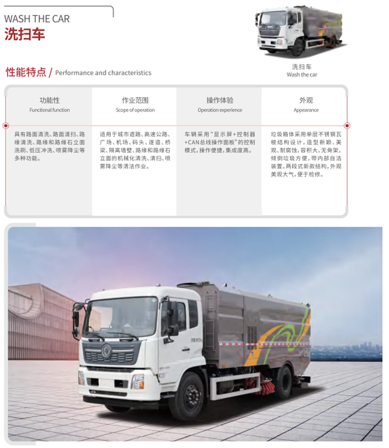 具有路面清洗、路面清掃、路緣清洗、路緣和路緣石立面洗刷、低壓沖洗、噴霧降塵等多種功能。